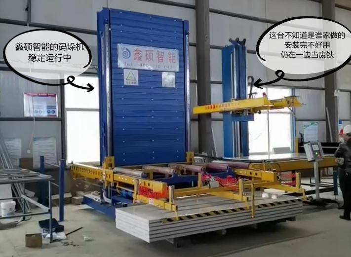 今日,山西客户新定的两台彩钢夹芯板码垛机顺利安装调试并投入生产使用。此前该客户于其他夹芯板码垛机厂家定制一台码垛机设备,安装之后始终问题不断导致客户无法正常使用,无奈之下只能仍在一边。然后于辽宁MK体育(中国)机械,定制3台彩钢夹芯板码垛机器人。安装调试之后,一直稳定运行使用中。客户给予MK体育(中国)高度认可。